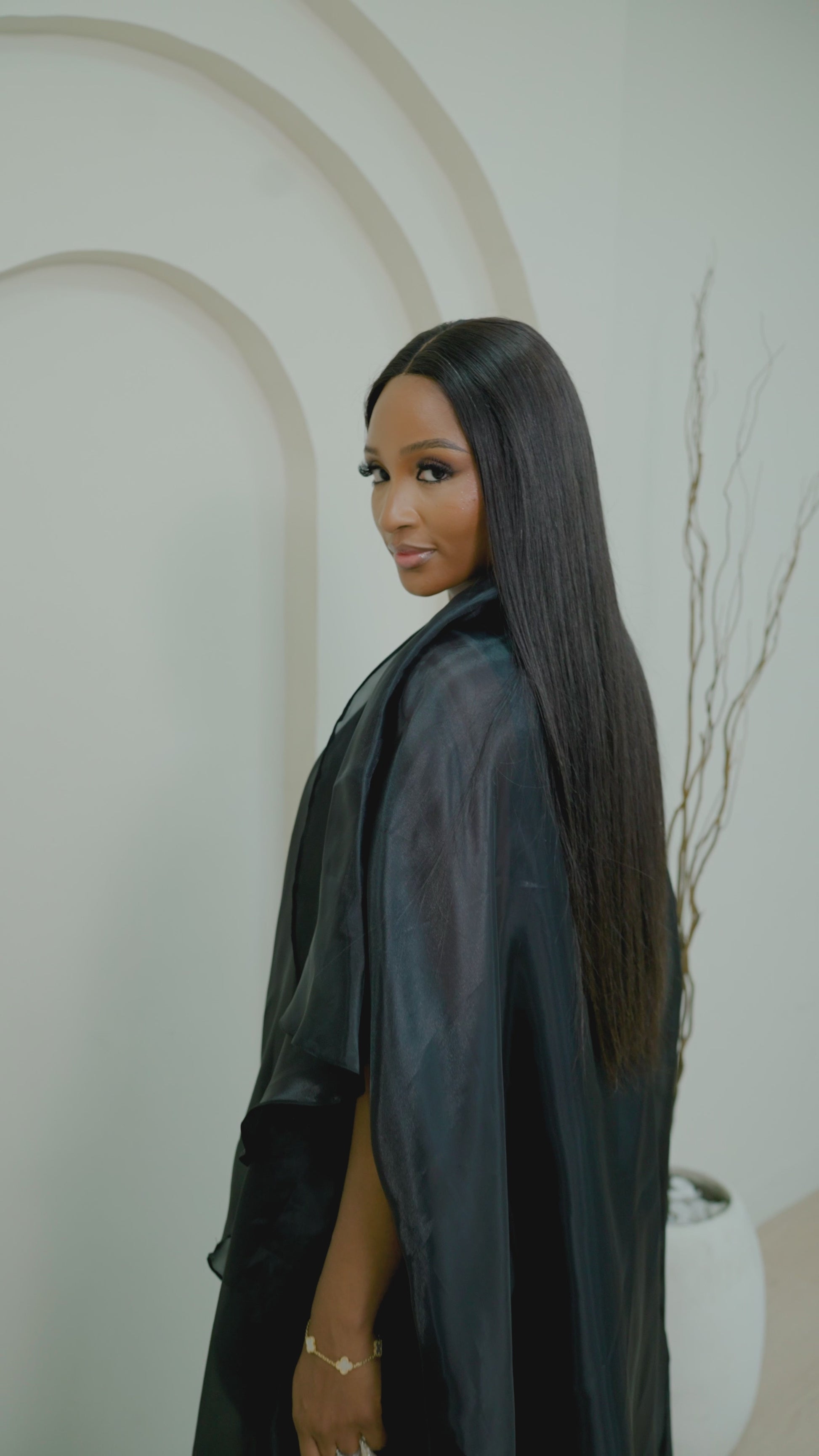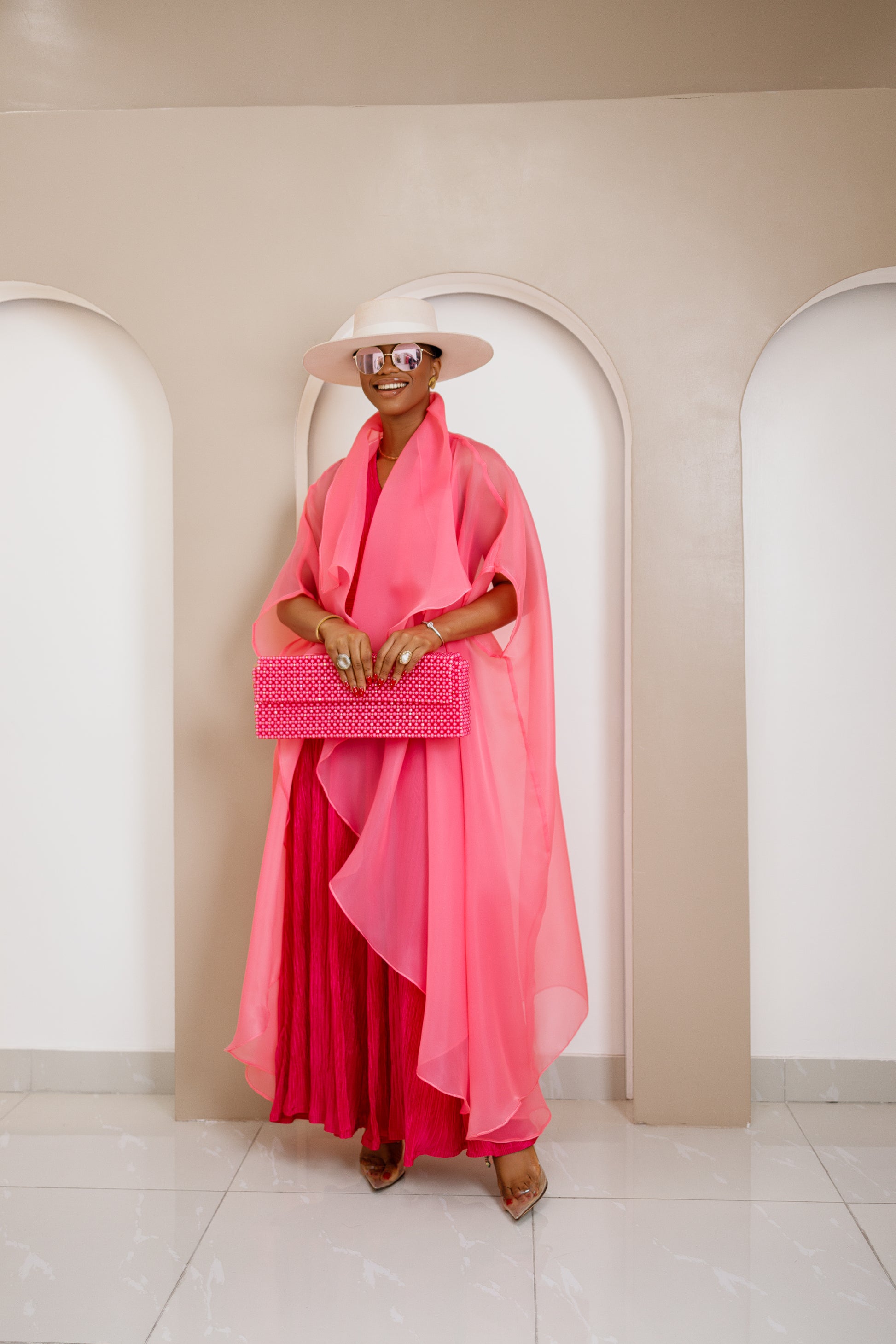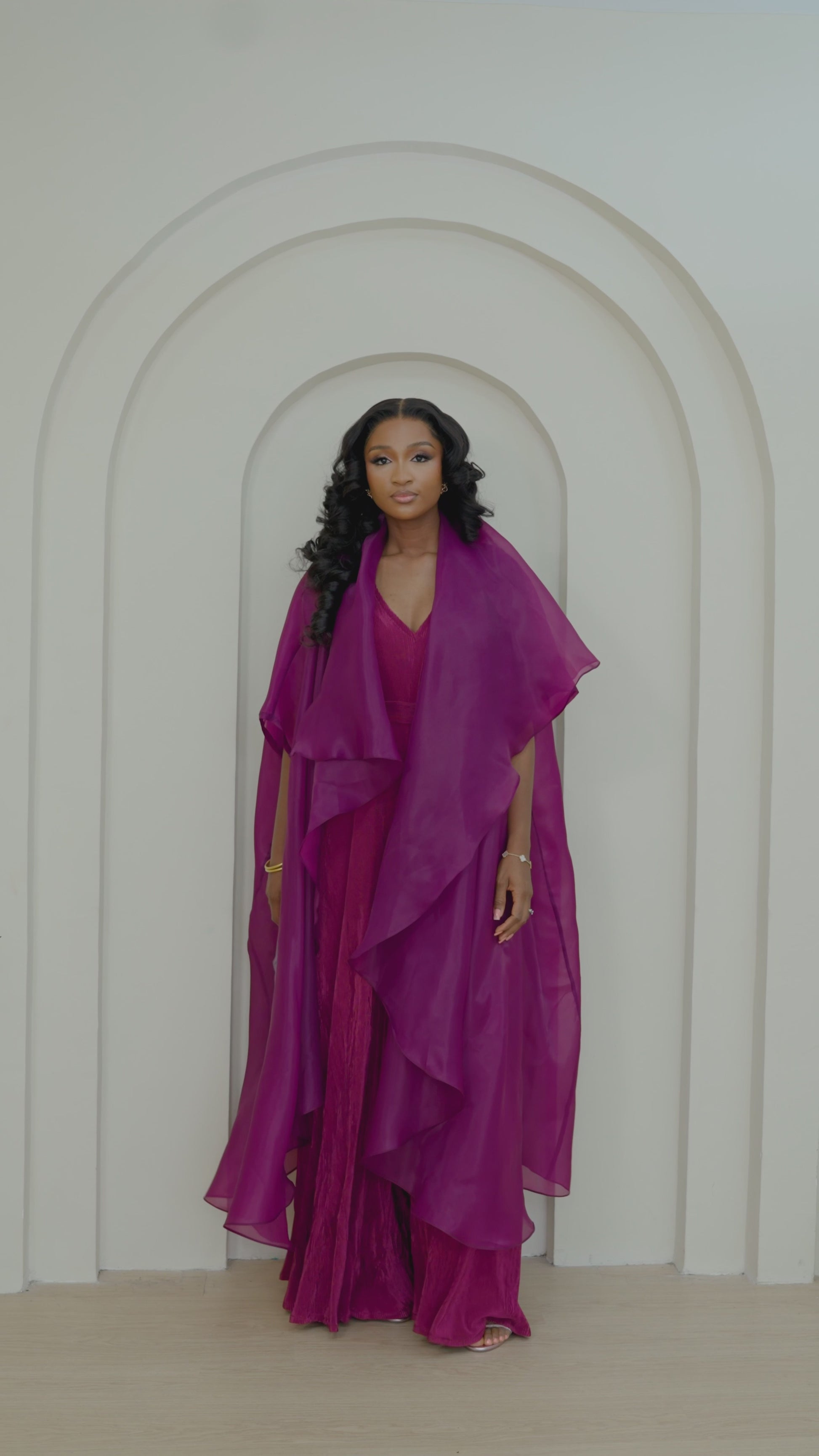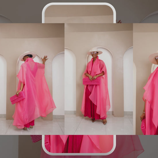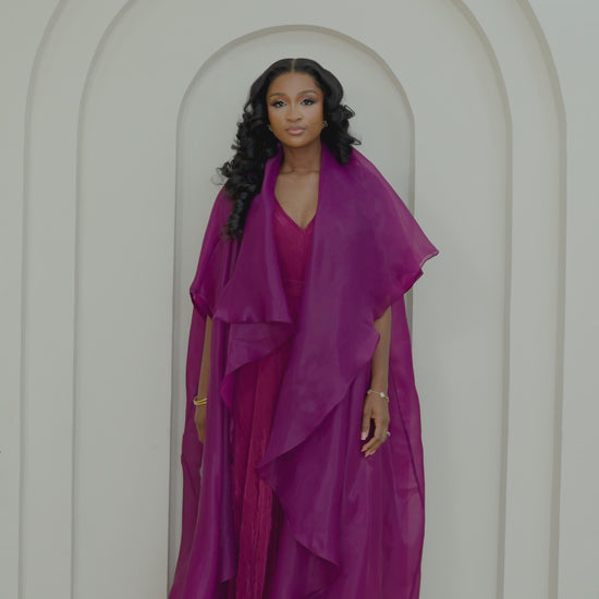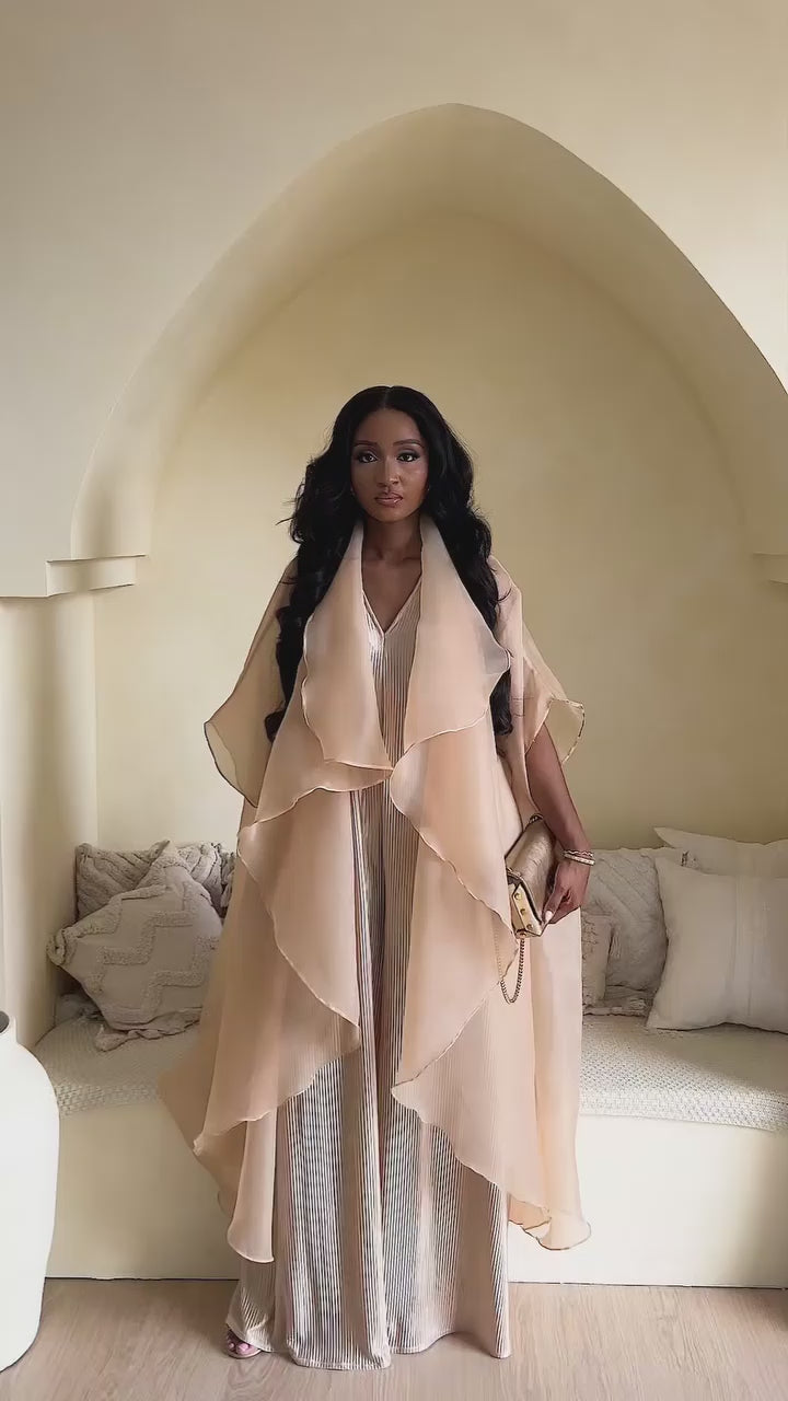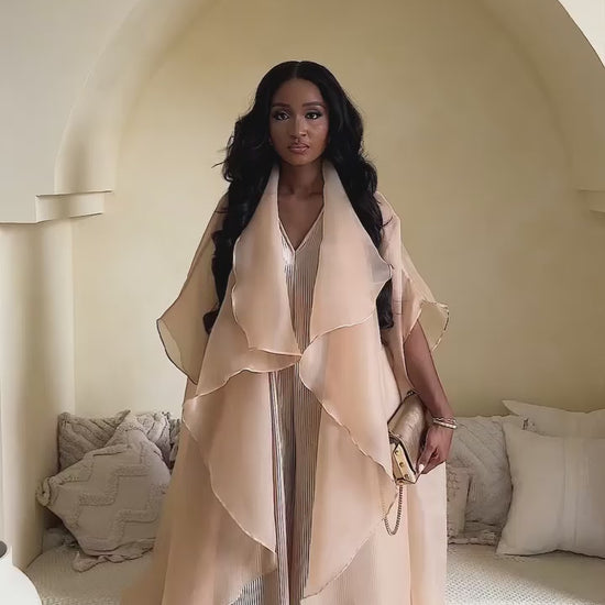 Layered with a sheer, multi-tiered organza kimono, the ensemble transforms into an ethereal statement of modern elegance. It's a celebration of fabric and form, designed for any event that calls for graceful confidence.