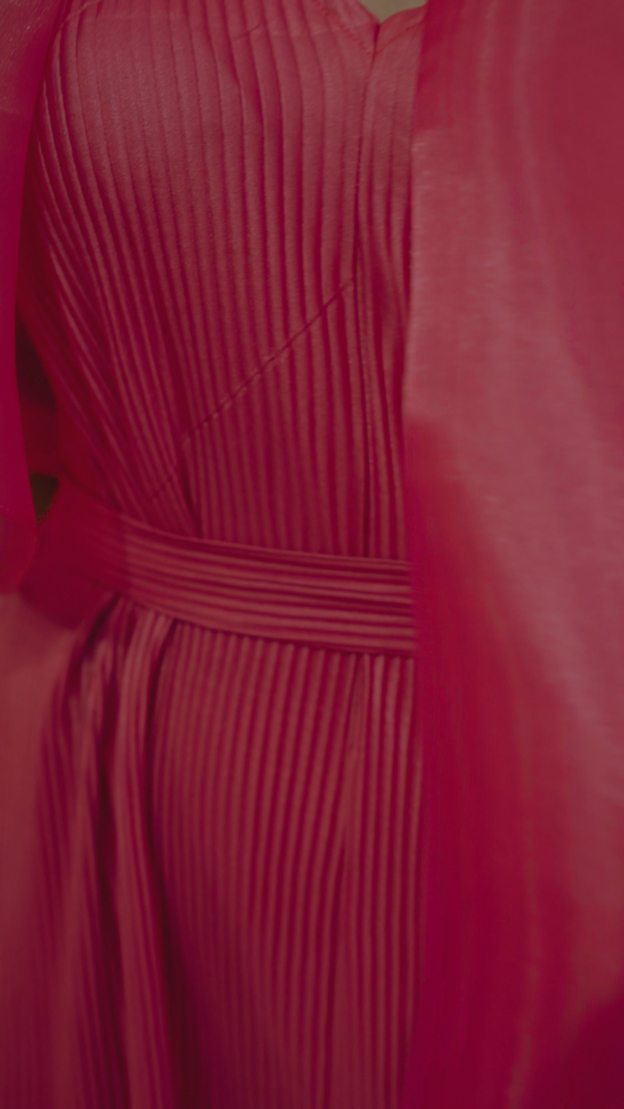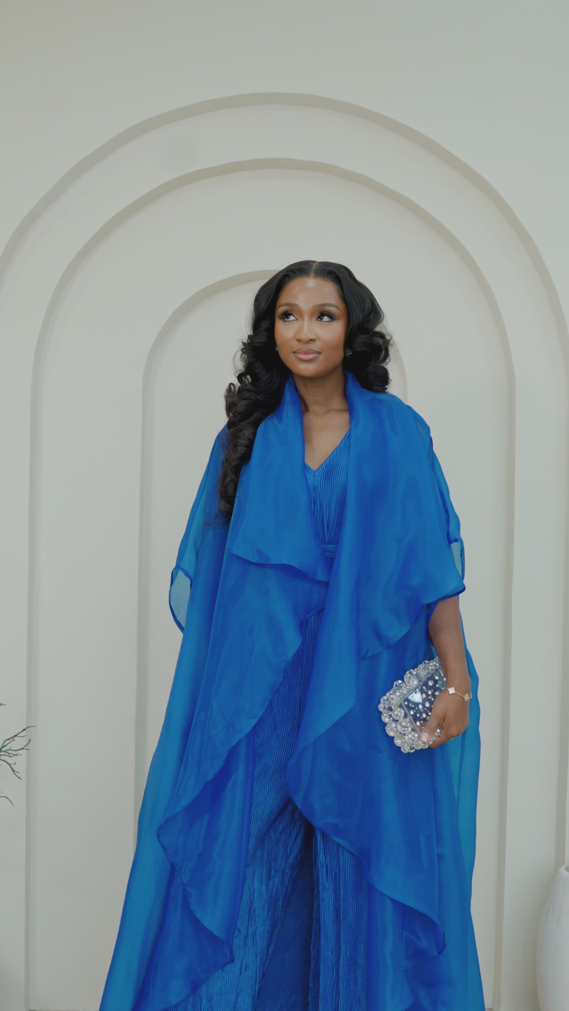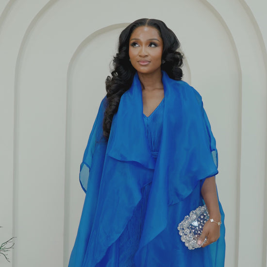 Experience the beauty of texture and movement with the Saeeda Set. The star of this two-piece look is the exquisitely pleated jumpsuit, designed with a wide-leg silhouette that flows and sways with you, creating a look that is both comfortable and captivating.
