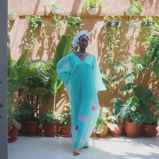 Introducing the **Vered Kaftan** from The Bojagi Collection – an exclusive artisan series where ancient Korean textile mastery meets Nahota Kanma's contemporary vision.