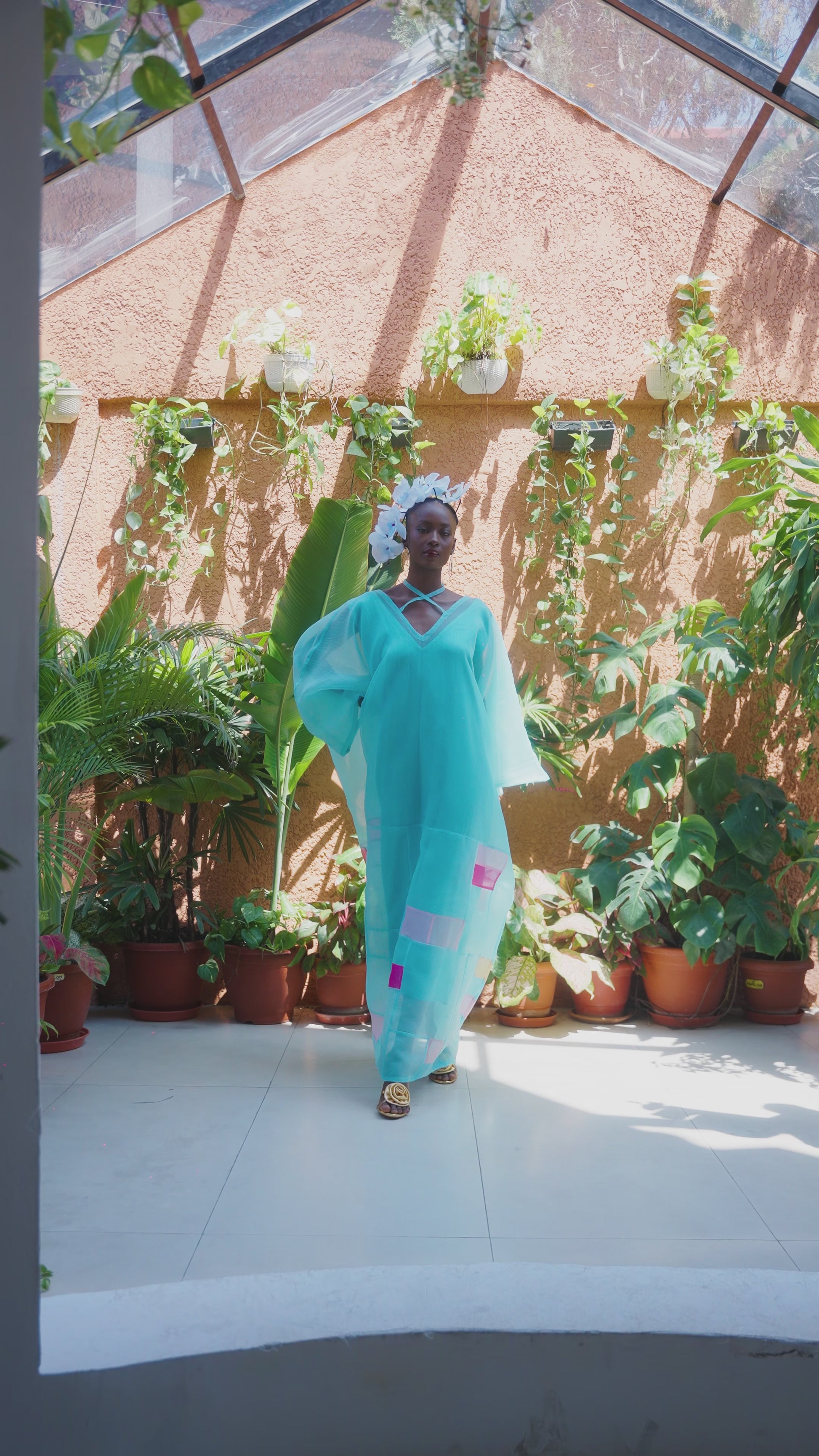Each piece is meticulously constructed using traditional patchwork techniques and precision tailoring, reimagined for the modern woman who appreciates true craftsmanship. Crafted from luxurious **seersucker fabric** in a timeless **aqua** shade, the Vered Kaftan offers effortless elegance and comfort.